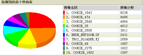 校园网防病毒公告 信息中心的趋势病毒防护服务器自9月份升级至7.0版以来,已注册安装的防毒墙网络版客户机总数: 1403台,被感染客户机的总数: 1040台;检测到62652个病毒,包括50349个间谍软件/灰件;在线客户机的病毒清除率:99%,间谍软件清除率: 99%。 图(1)中显示的是趋势病毒防护服务器近期检测到的前10种病毒,请用户注意防范。 图(1) 图(2)中显示的 趋势病毒防护服务器近期检测到的前10个感染源,请下列机器名的用户对自己的计算机采取防毒措施,及时更新防病毒系统。 图(2)
