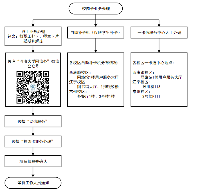 办理地点 | 自助补卡机分布点 西康路校区:网络馆1楼用户服务大厅 江宁校区:图书馆大厅、行政楼2楼 常州校区:各餐厅1楼、3号楼1楼 人工办理点: 西康路校区:网络馆1楼用户服务大厅 江宁校区:致用楼113 常州校区:2号楼F111 |