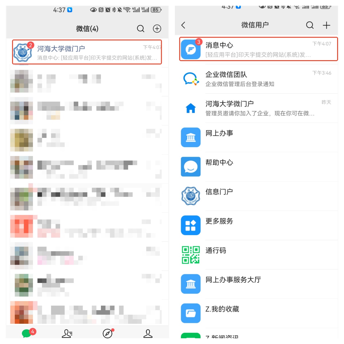 Tips2:微信端待办中心即刻办理:河海大学微门户消息中心实时接收待办提醒,点击待办事项即刻办理。