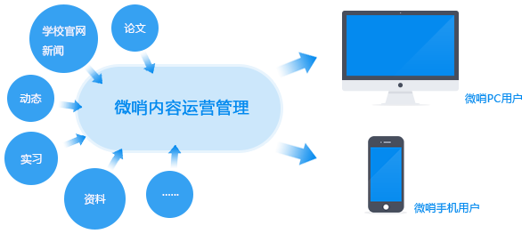 同时,学校还可以对内容做运 营,将学校的重要新闻、动态、就业实习指南等等与微哨对接,原本访问量只有几十人次,通过微哨,可以放大几十倍,真正的满足学校对内容展示、宣传、营销推广的需求。