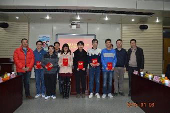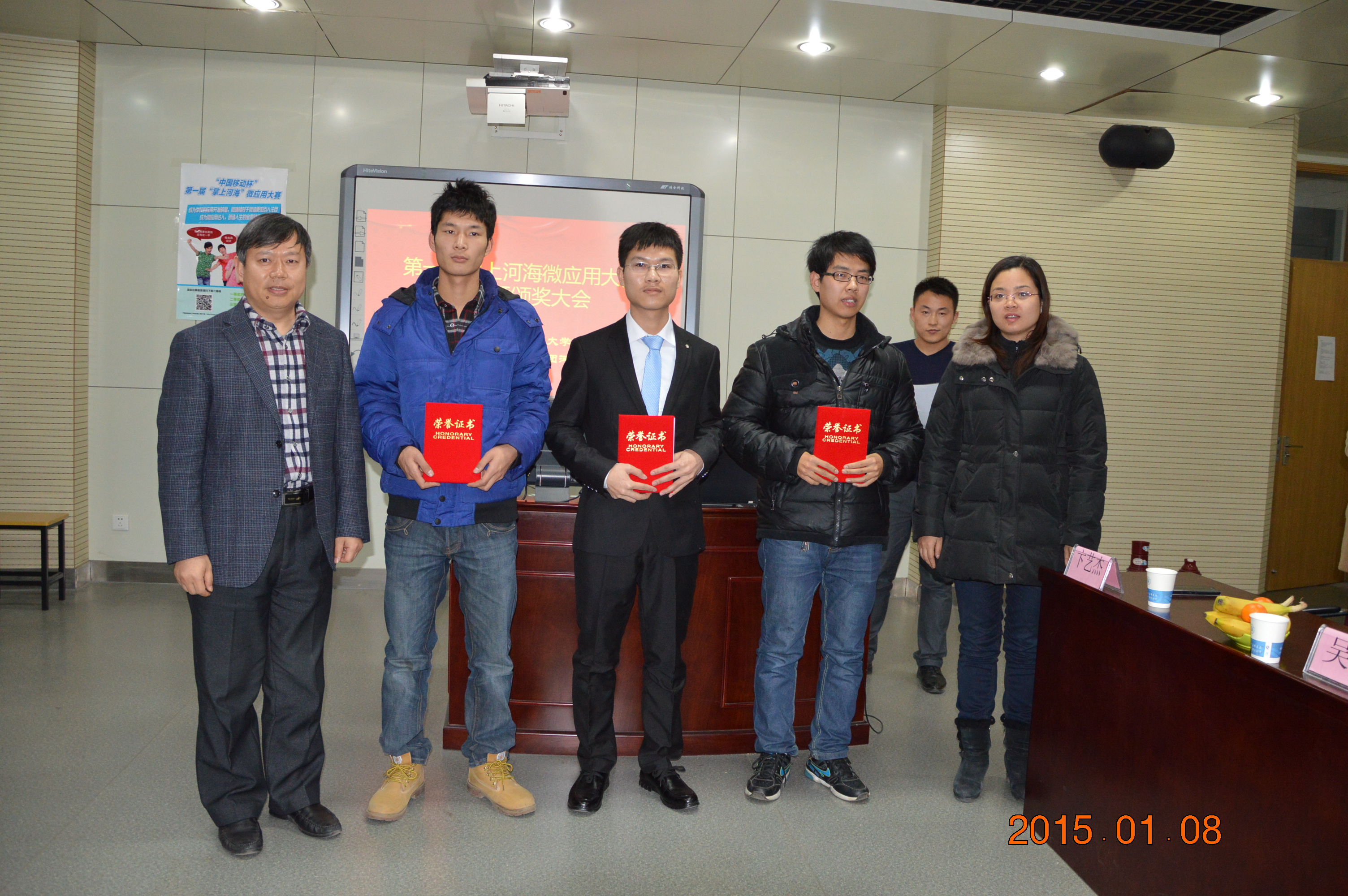 2015年1月8日下午2:00在博学楼A412室举行了此次大赛的颁奖大会,参加的领导有:河海大学信息中心卞艺杰主任、河海大学校团委吴红书记和陈伟刚副书记;参加的专家有:东南大学网络与信息中心的陶桦主任、南京大学网络与信息中心的刘建峰主任、南京农业大学图文与信息中心的罗国富主任,所有参赛队伍及其亲友团届时也参加了本次颁奖大会。大会分为两个阶段:评奖阶段与颁奖阶段。在评奖阶段中,每一位参赛选手都精心的准备了ppt并且将一个月的努力围绕ppt为在场的师生进行讲解,对自己开发的轻应用进行了使用演示;专家组仔细听取了参赛选手的汇报并提出改进与完善的意见,最终,在26个参赛项目中共有18个项目脱颖而出,其中规定题目作品12个,自选题目作品6个,获奖人次为49人。在颁奖之前,卞艺杰主任上台致辞,对所有参赛选手的作品作出充分的肯定,对所有师生的努力与付出表示衷心的感谢,他希望河海大学的学生应该发挥自己的主观能动性,作出更多更好的轻应用为全校师生使用。最后,在欢乐的音乐声中领导和专家为获奖选手颁发证书并合影留念,此次颁奖大会圆满落下帷幕。