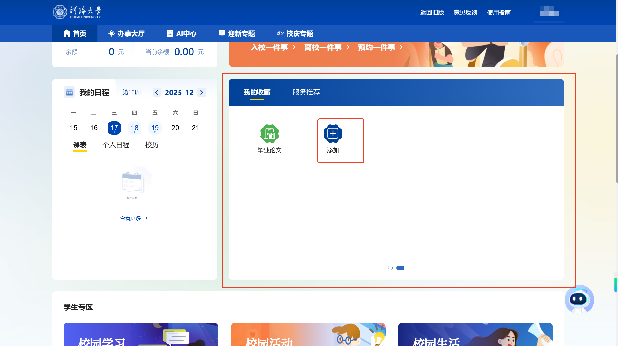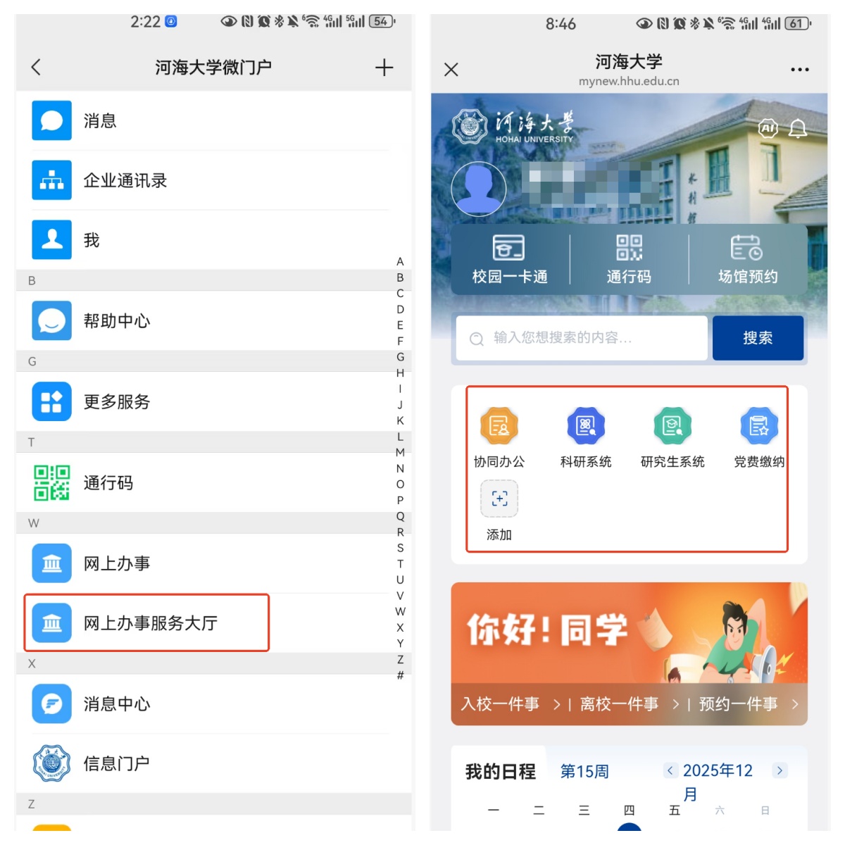 Tips2:微门户端收藏:在河海大学微门户—网上办事服务大厅中查看和收藏应用,内容与PC端自动协同。