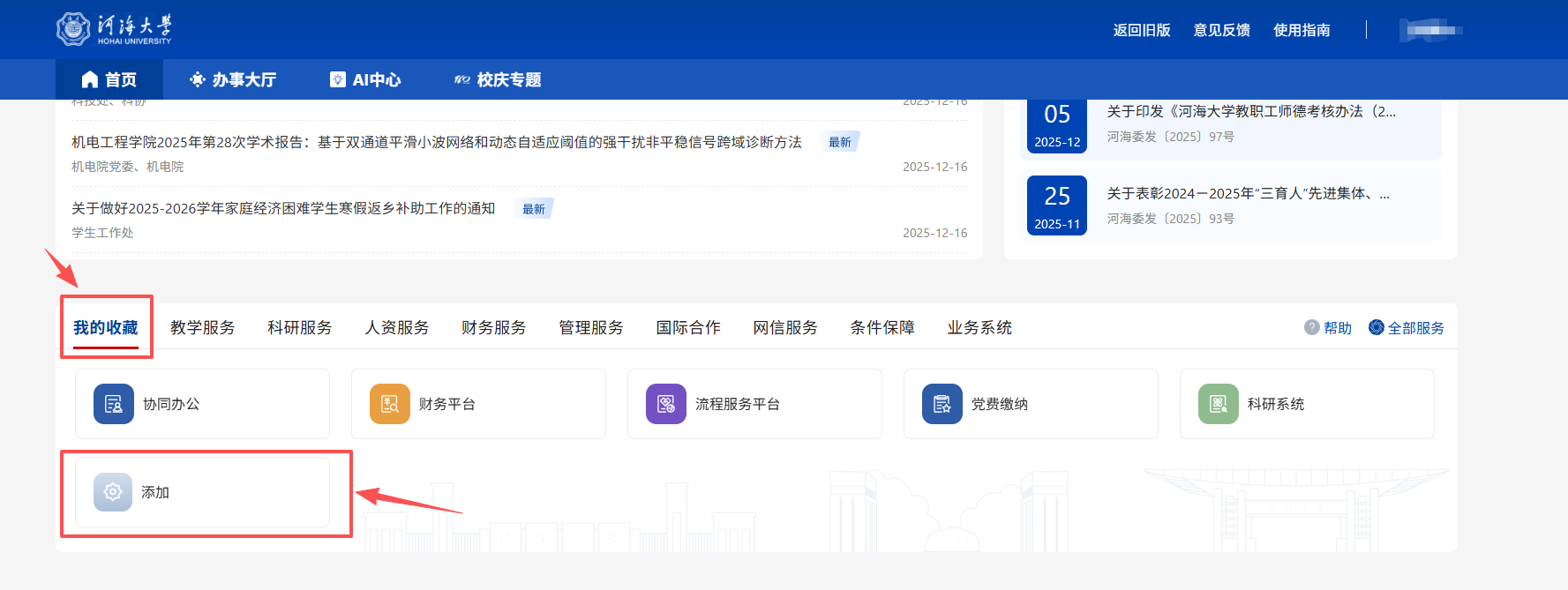 Tips2:微门户端收藏:在河海大学微门户—网上办事服务大厅中查看和编辑收藏应用,内容与PC端自动协同。